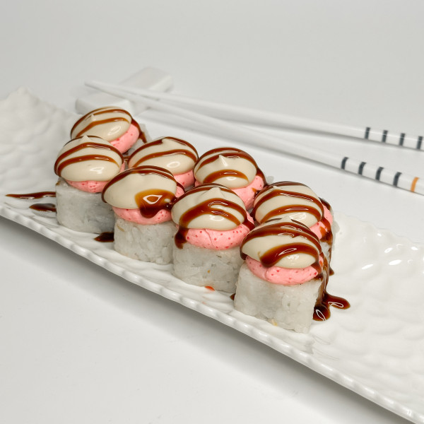 Рис, нори, помидор, курочка темпура, болгарский перец, сливочный сыр креметте, соус унаги 300 грамм/8 шт