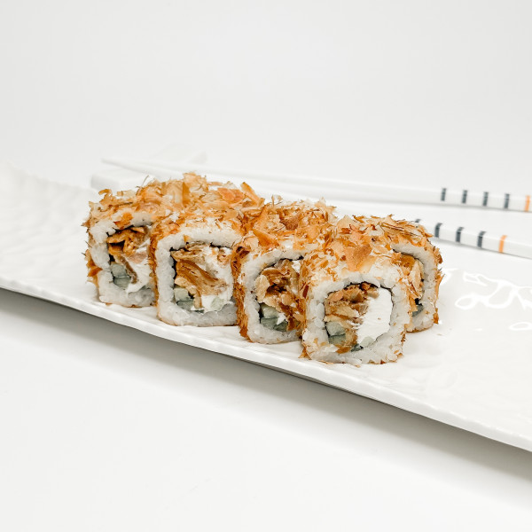 рис, нори, творожный сыр, икра лосося, свежий огурчик, сушёная стружка тунца, 8 штук