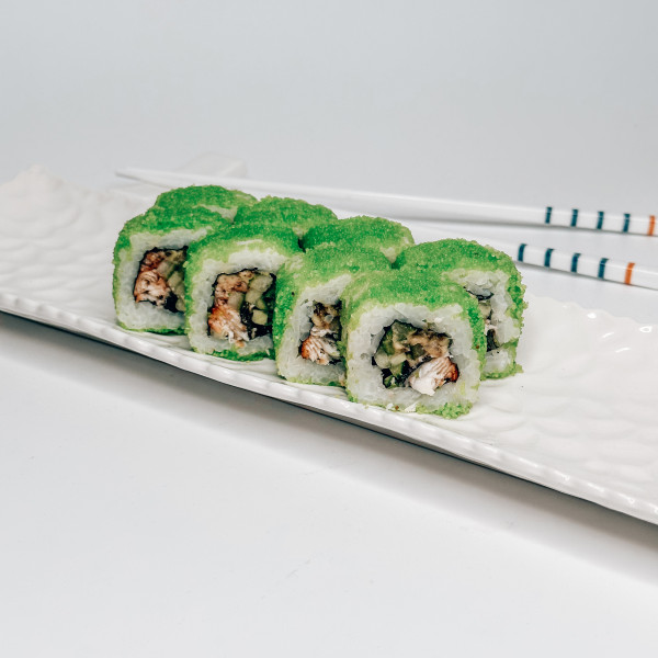 Рис, нори, свежий огурчик, спелый авокадо, майонез, угорь, икра капеллана, 8 штук 240 г.