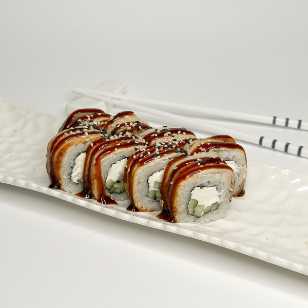 Рис, нори, творожный сыр, норвежский лосось, копчёный угорь, унаги соус, семена кунжута, 8 штук