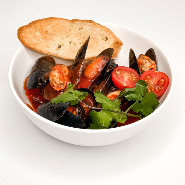 Мидии черноморские, фирменный томатный соус, специи, зелень 320 грамм