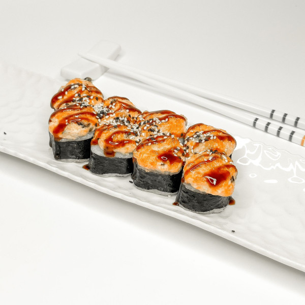 Рис, нори, японский омлет томаго, свежий огурчик, мясо мидий, сыр моцарелла, икра масаго 230 грамм/8 шт