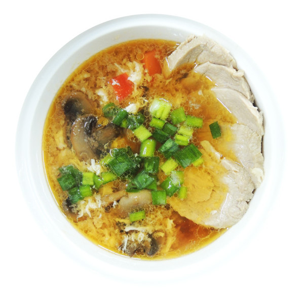 Свинная вырезка, овощи, грибы, яйцо, водоросли вакаме, лук зелёный