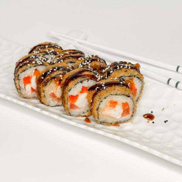 Рис, нори, тигровая креветка, помидор, болгарский перец, соус спайси 270 грамм. 8 штук