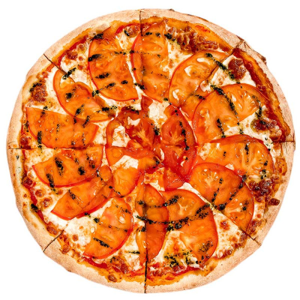 Классическая пицца на тонком тесте с соусом Мутти, сыром Моцарелла, свежим помидорчиком, сочной зеленью