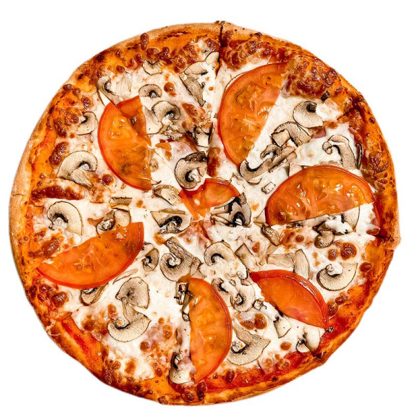 Тонкое тесто, соус томатный мутти, нежная ветчина, грибы, сыр Моцарелла, помидор, 32 см