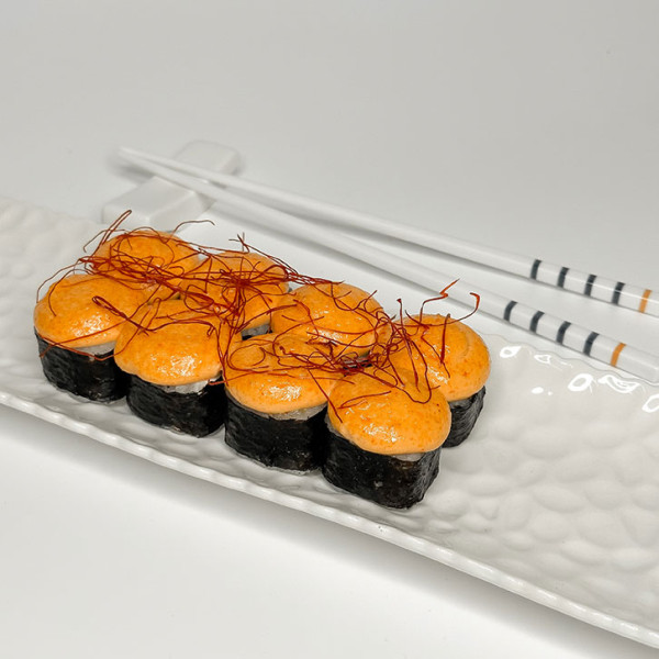 Рис, нори, лосось (тунец, угорь, креветка) сыр сливочный, спайси соус, нити чили. 260 грамм. 8 шт.