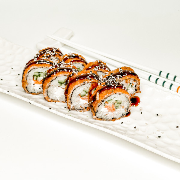Рис, нори, сёмга, сливочный сыр, кляр, сухари канеширу, соус унаги 250 грамм/8 шт