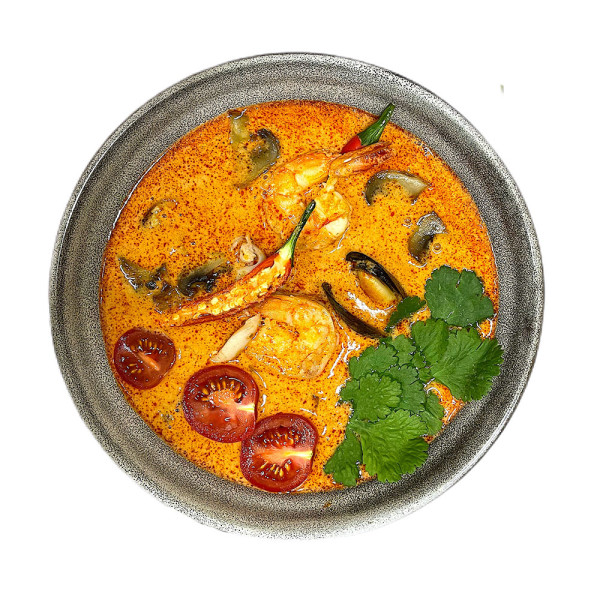 Креветки тигровые, мидии, кальмар, грибы шампиньоны, фирменный бульон, кокосовое молоко, перец чили, лайм, имбирь 470 руб 400 грамм