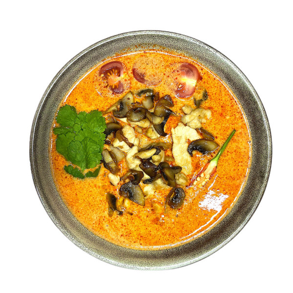 Куриное филе, грибы шампиньоны, фирменный бульон, кокосовое молоко, перец чили, имбирь, помидоры черри 390 руб 400 грамм